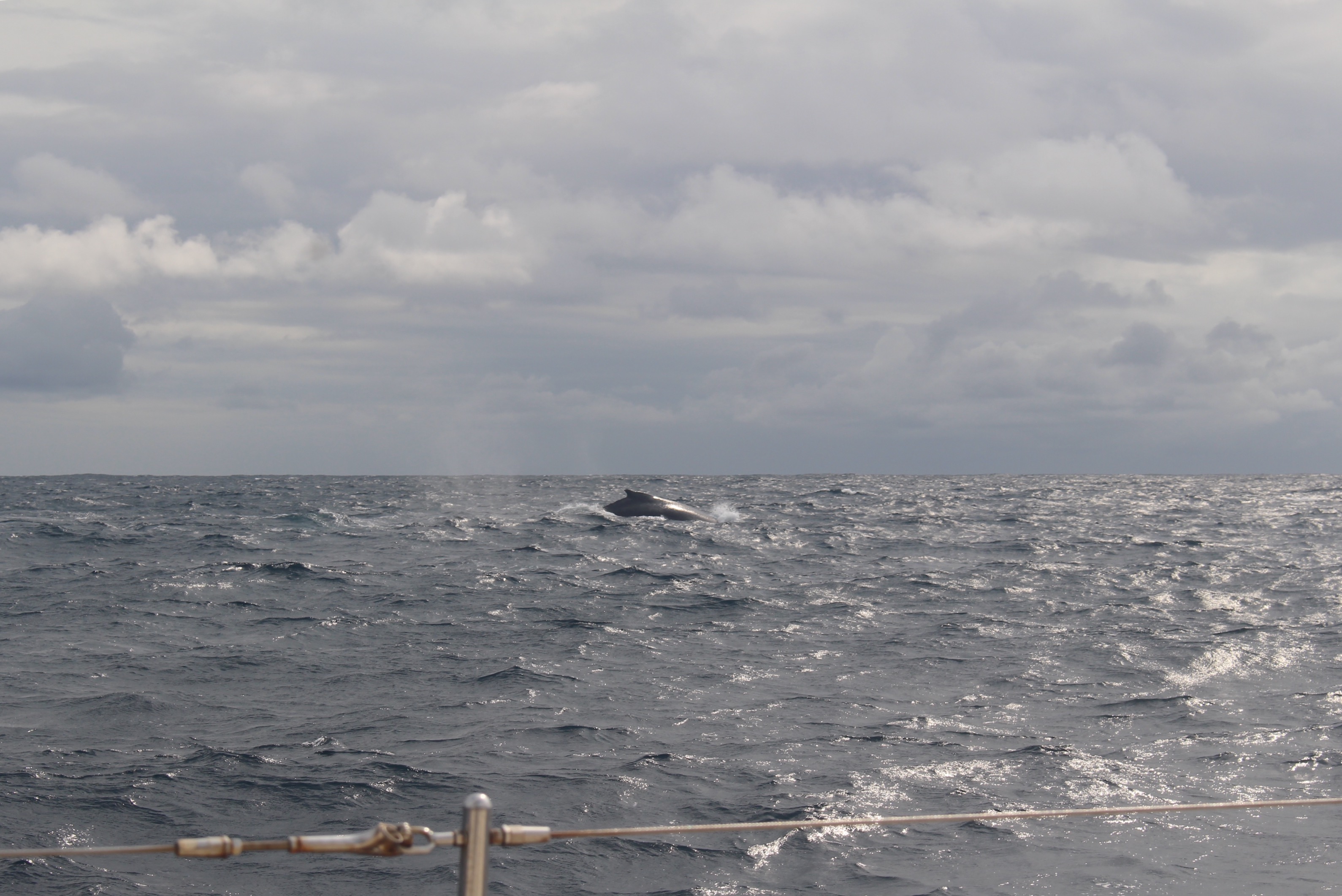 It was a challenging passage, with a little of everything, but not much pleasant sailing. As Nora says, this ocean is either on or off, not much in between. We had winds to 37 knots (top gust 55 knots according to Tahawus, but I attribute their big numbers to the violent rocking of a monohull, with the wind instruments 60 feet above the deck), and twice we had to motor. Some very lumpy waves. Awesome lightning displays. We did exactly what the experts advise not to: cross the Agulhas Curret with a strong southerly wind. But our weather router assured us that the current was not running strong, and in fact it appeared to be only about one knot. Whales welcomed us to Durban.